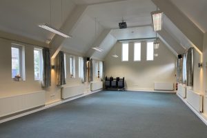 The Main Hall is light and airy, with picture windows overlooking the Village Green along the long side. It is reached via the entrance foyer, with level access for wheelchair users. There is a door and serving hatch giving direct access to the kitchen, with a separate door leading to the cloakrooms. There are 56 folding chairs for use in the hall (with 30 more due to be purchased in 2022).